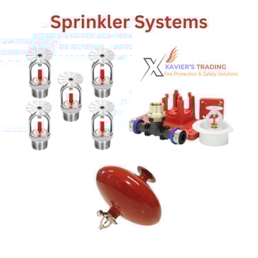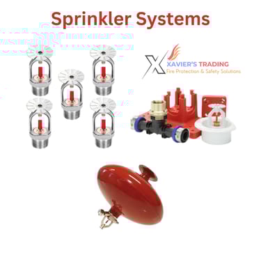 Sprinkler systems (wet/dry/pre-action/deluge), sprinkler heads, valves, flow switches